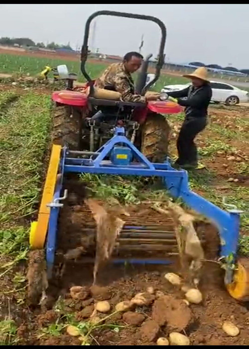 山東曹縣魯富機械紅薯收獲機與小四輪拖拉機傳動軸連接,經(jīng)主傳動軸上偏心塊、連桿帶動挖掘鏟作前后往復(fù)運動,再由傳動軸左端齒輪帶動過橋軸上變速齒輪,并改變傳動方向,再經(jīng)鏈條帶動分離排鏈主傳動軸,并由主傳動軸兩端偏心塊帶動振動篩上下抖動。在拖拉機的牽引下,使挖掘鏟挖掘出來的馬鈴薯(大蒜、地瓜等)鋪放在分離排鏈上,在分離排鏈的轉(zhuǎn)動下土落在分離排鏈下方,馬鈴薯(大蒜、地瓜等)和未落下的土塊,在分離排鏈上面落在振動篩上,再次清選分離后集中鋪放在機后地面上。